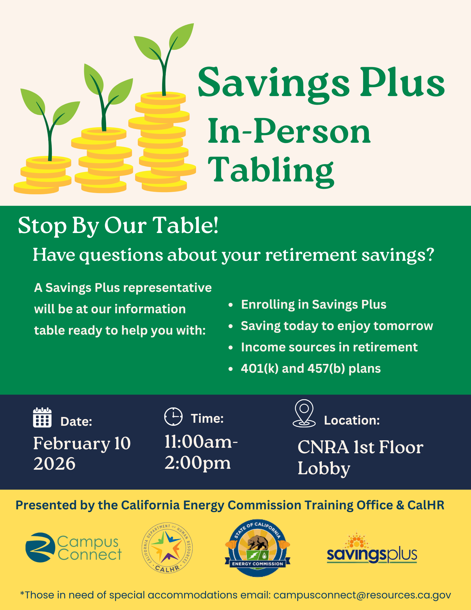 Description: This is an opportunity to ask a Saving Plus representative questions and gather resources to put you in the best possible position for retirement. *Those in need of special accommodations email: campusconnect@resources.ca.gov